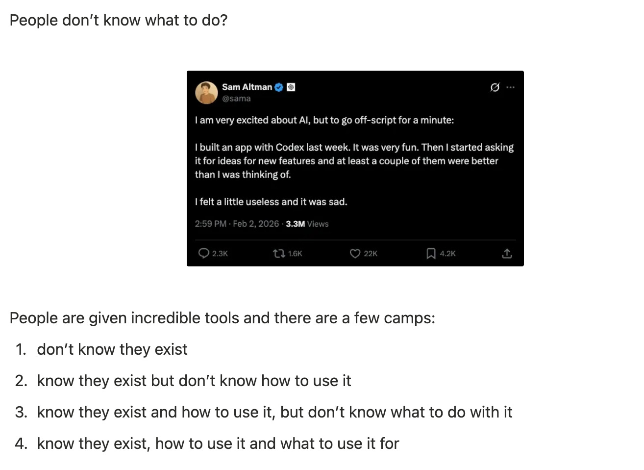 Most people don’t know what to do with AI, how to use it effectively; which tasks to offload. It’s like being give $100 billion and then not knowing how to spend it.
